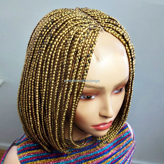 Short Bob Braid Wig, Black Women Shoulder-Length Human Hair Closure Single Box Braids, Gold Centre-Part Wig